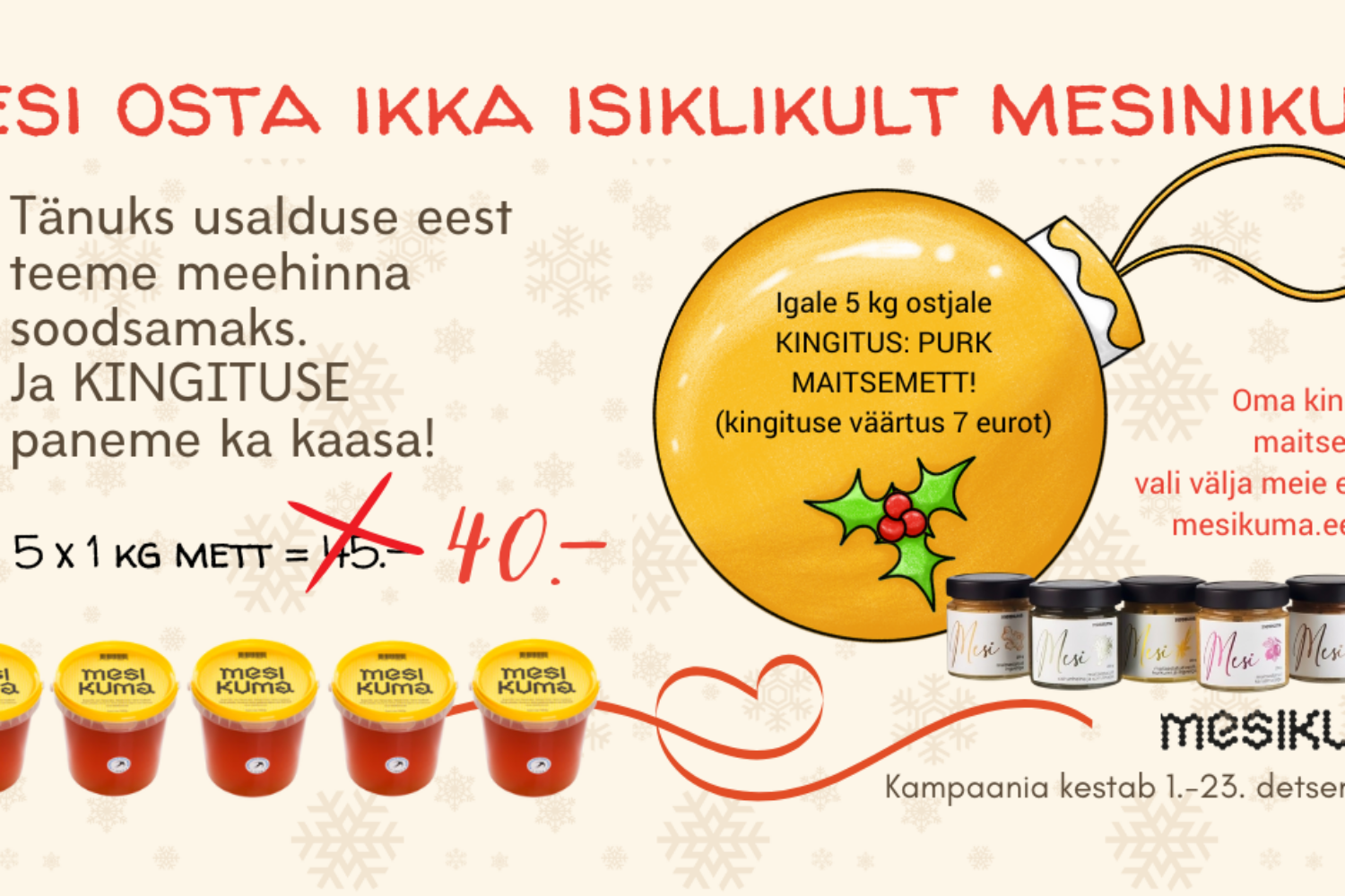It’s beginning to look a lot like Christmas everywhere you go …. Mesinikule tähendab see, et käes on klassikaline aktiivne meemüügi aeg. Tõsi, meesõpru on tänavu vähe, tuleb lausa otsida (uu, kus te olete?). Eriti pärast eilset võltsmee teemat Pealtnägija saates. Selles avaldati Eesti suurematest jaekettidest korjatud mete DNA-testide tulemused. Tegelikult oli hästi: enamik Eesti mesinike mett on ehtne ja seda kinnitas ka DNA-test: valikus olnud 35 Eesti kohalikust meest kukkus läbi 3 (kõik need kolm olid ühe pakendaja tooted).