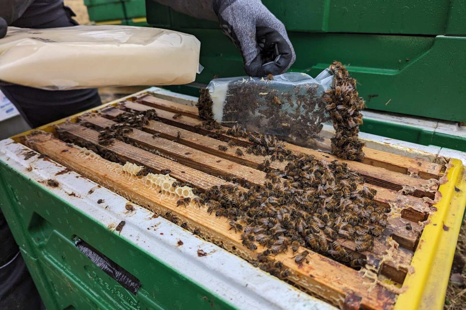 Tühi pakk ära, täis pakk asemele: abiks on praktikant Enely. Kui mesilased on ees, võib neid vaikselt eemale puhuda, et mummud kandipaki ja raamide vahele ei jääks.